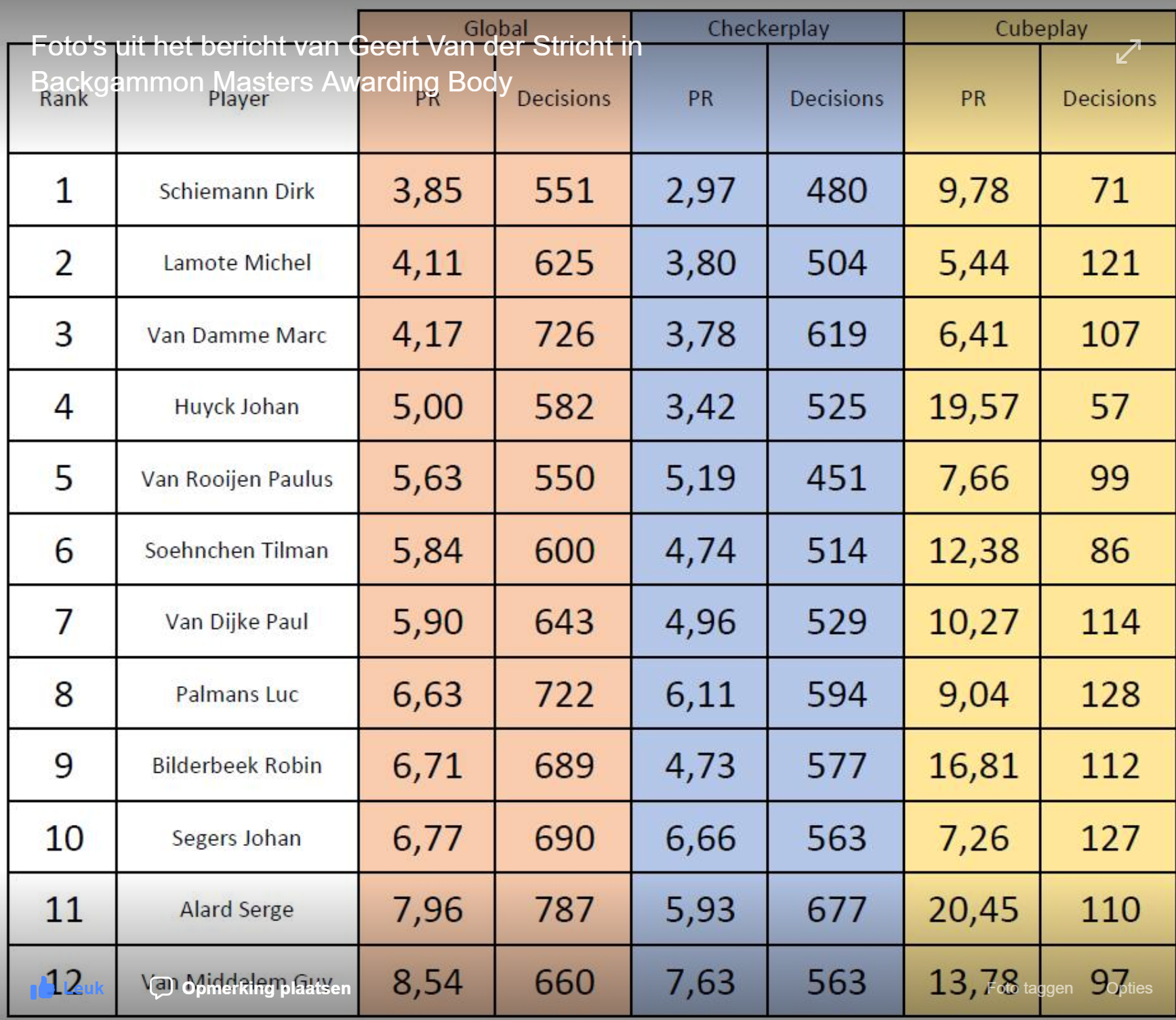 All in all, the level of play at this tournament was very decent. The average PR of all players combined was 6,01. Most players played slightly better than their current BMS rating, which deserves praise. Funnily, the bottom 6 players on the PR list scored the most wins, namely 16 versus only 14 for the top 6. Most victories were scored by Paul Van Dijke (4 wins : winner of the Xmas Trophy) and Johan Huyck (4 wins : runner-up).