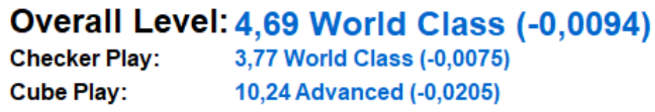 This shows that 5-point matches are very difficult from Game 1, especially the cube actions. Marc’s Cube PR (10,24) should illustrate that abundantly. I therefore urge tournament organisers to allow the EUBGF-approved and BMS-conform 2 minutes per point even for shorter match lengths.