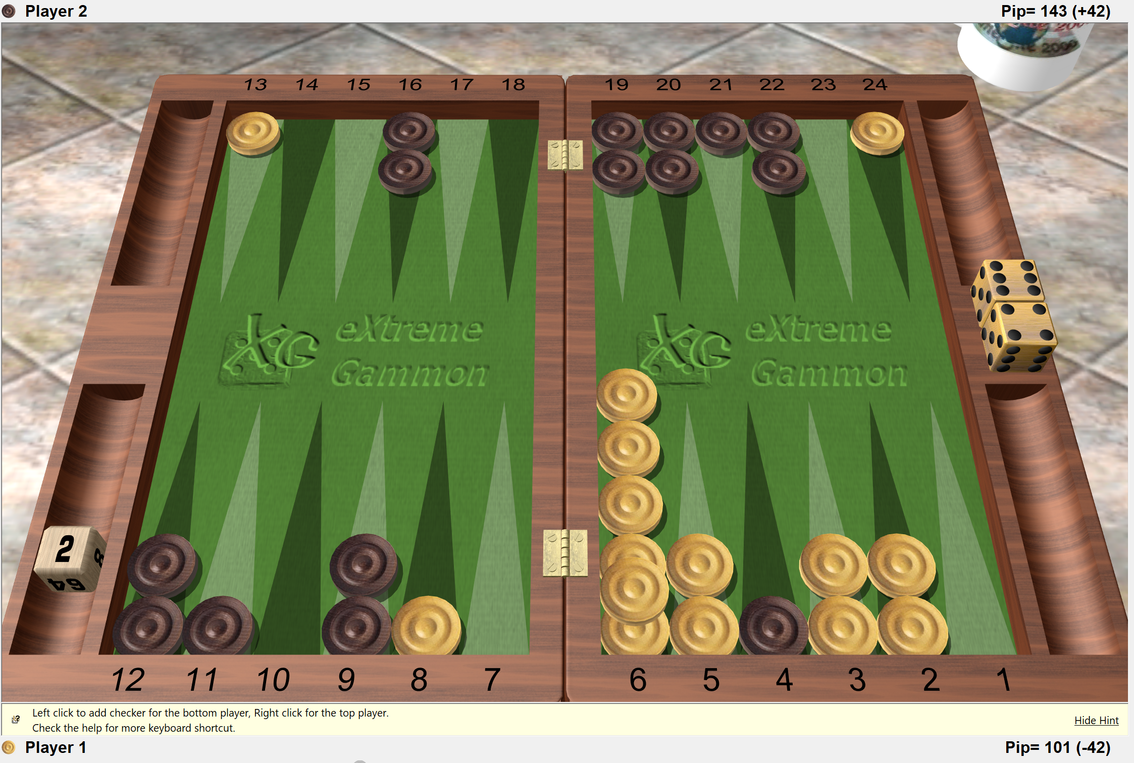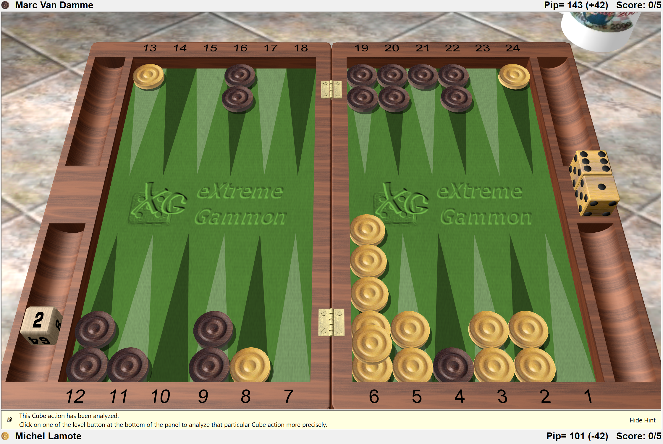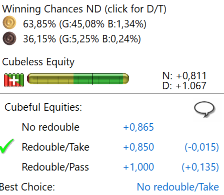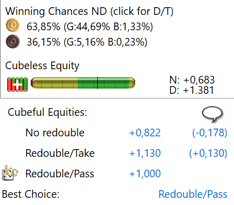 However, in a 5-point match, things become very complicated. After the cube is turned, it will have a value of 4 and with the gammon price being only 0,25, the 45% gammons only have a value of 11%, instead of 22% (for Money). Moreover, should Black ever have the chance to recube to 8, the gammon price would become 0 ( = zero) and all White’s gammons would evaporate. Here is the correct cube action ats ( = at the score). Suddenly, not accepting the cube would be a clear blunder :