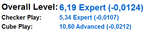 There can be no doubt that Johan has made significant progress over the past year. Making the step from Advanced Class 1 (or Expert) level to Master (Class 3) level is not a walk in the park. Although Johan has to combine his backgammon study with the duties of a professional career and those of a devoted husband and father, he has succesfully managed to lift his game to the skill level that earns him the title of Backgammon Master. Congratulations!