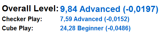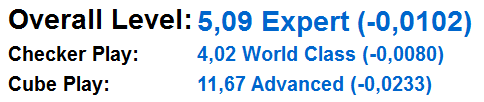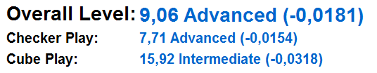 His opponent, Geert Van der Stricht, took the more straightforward route to a strong PR : World Class checker play, combined with an above 10 cube play PR :