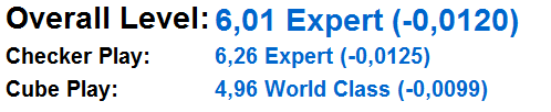 In his most recent Master Series, consisting of six consecutive 15-point matches, Johan was able to solidify his Master Class 3 status with a fine PR of 6,01. Surprisingly, his cube play turned out to be better than his checker play. This is seldom seen, since most good players routinely score World Class PR’s (5 or lower) in checker play, but rarely dip below Advanced level (10 or lower) in cube play. Johan managed to score a stunning 4,96 (!!) PR in the most complex domain of the game :
