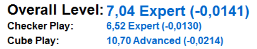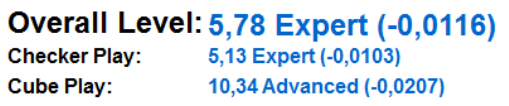 A heartening performance by Walter, comfortably within his Master Class 3 range. The rightful jubilation of Walter’s many fans will be slightly dampened, however, when they see that this below-6 PR does not translate into a step forward on the BMS Grading Table (current standing : 6,27 (5)). Culprit to that are the below-par performances by Walter in the 2017 BIC competition. Although Walter has been steamrollering all opposition, he has not done so by playing world-class backgammon. Or has he become a convert to the anti-dogmatic play-worse-to-win-more school of thought?