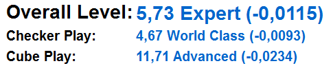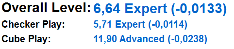 Johan played 2 matches at an astonishing level : PRs of 3,39 and 3,34 serve to illustrate his potential. However, these promising performances were sadly offset by matches where PRs rose above 8. It cannot be a coincidence that these were the matches where Johan’s cube play was at its worst. Although his checker play was consistently Expert or better, his cube decisions were frequently wide of the mark. Like all of us, Johan has room for improvement here. But, hey, would we play this game if it were easy?