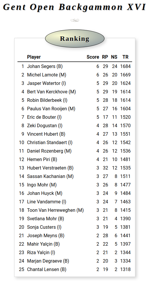 Paulus Van Rooijen and Bert Van Kerckhove share 2nd prize.  Jasper Watertor, organizer of the Rotterdam tournaments, wins the intermediates on resistance points and shares prize money with Robin Bilderbeek and Eric De Bouter. Johan Segers wins the beginners division and receives a backgammon book to up his level of play even more!  Maybe next time he can compete in a higher category…
