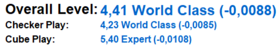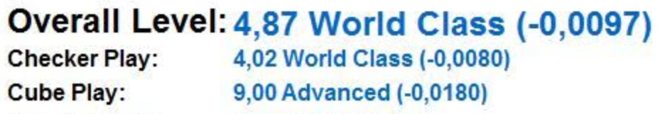 Geert’s dedication and hard work are bearing fruit. XG’s evaluation (“World Class”) is not just a flattering epithet. It is a reliable and accurate reflection of a player’s skill level. True, in a Master Series, there is not much at stake and players can approach the challenges on the board in a purely academic fashion, but have a look at how Geert did in Monte Carlo, during the most recent World Championships :