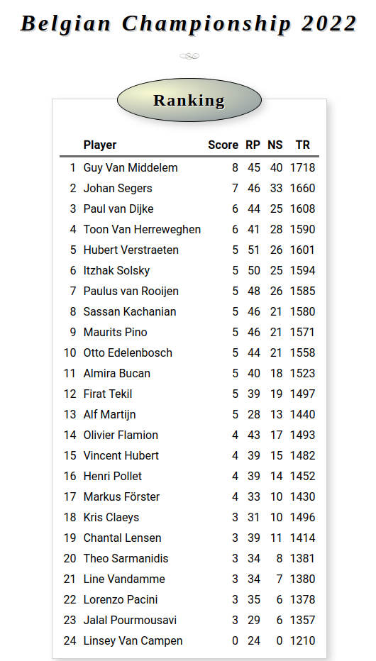 After day one, Itzhak Solsky was in pole position with five victories in five matches. On day two, however, his fortunes turned, and he was overtaken by his pursuers. In the end, it was Guy himself who only had to concede one match in the whole tournament, against former champion Paulus, to end on top of the ranking. Runner-up was Johan Segers, who lost only from Itzhak on day one and from Guy on day two. The third place (six victories in nine matches) was shared between Paul van Dijke and Toon Van Herreweghen.