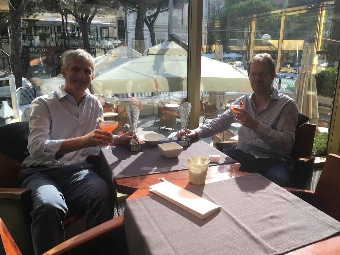 Johan (r) and me (l) celebrating our win at the hotel bar with our trophies and a Hemingway cocktail (foto : Tilman Söhnchen)
