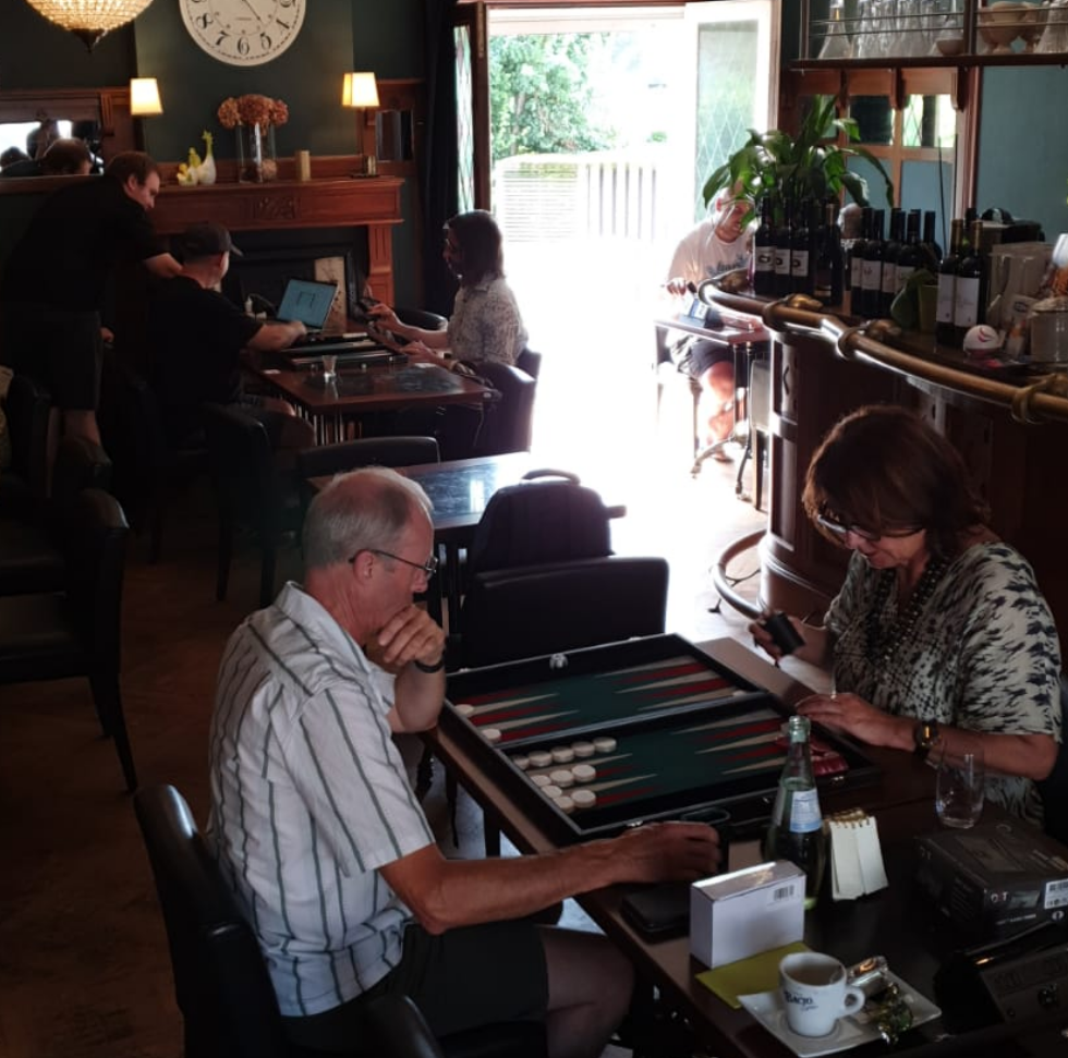 The first edition of the Belgian Backgammon Beach Day took place on Sunday, September 10, 2023, in Hotel-Restaurant Villa Marie-Joseph, Westende, a few blocks away from the beach. Sixteen players were treated on delicious breakfast and lunch while playing seven 5-point backgammon matches in the beautiful retro setting of the hotel. During breaks, ice cream and cocktails could be enjoyed on the sunny terrace.