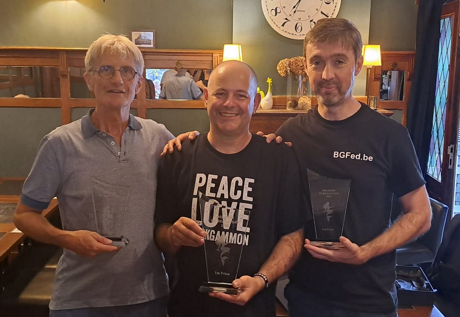 Podium of the 1st Belgian Backgammon Beach Day, on September 10, 2023, in Westende. From left to right: Michel Lamote (3), Johan Brisaert (1, organiser), Johan Segers (2). - 14th Leuven Backgammon Open, Sunday 12 Nov 2023