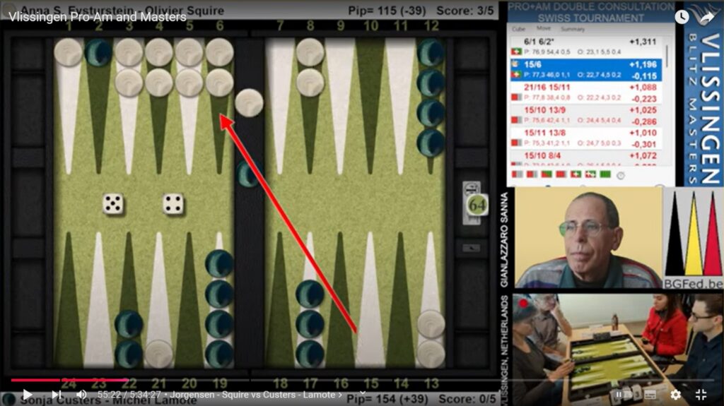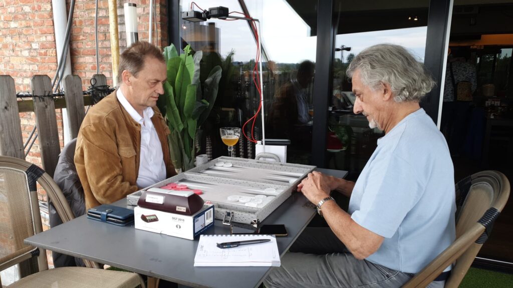 Having lost their first-round duels in Level 5, Maurits and Alain now need to start winning if they want to stay in the RBL. The duel took place at Maurits’ spacious and airy apartment, optimal playing conditions for a crucial RBL encounter. Maurits won M1 (7-3) with a strong 6+ PR, leaving Alain trailing 2-0. Alain, who staged last season a memorable comeback from 1-5 down against Nick De Ruyck, was not intimidated and won M2 (7-3) with a PR of 9,93, beating Maurits’ PR of 9,99 with an excruciatingly small margin of 0,06: 2-2. Since nobody could be sure if these PRs would hold under the sharper XG ++ analysis, both players remained in the dark as to the exact score, 2-2 or 3-1. That is, however, part of the format as there is no time between matches to do the time-consuming re-analysis. Maurits left nothing to chance in M3: he produced his best PR of the season (5,57!) and eventually won the match after some harrowing turnarounds: 4-2. Note: XG++ did reverse the PRs of M2 to 10,38 (Maurits) vs 10,42 (Alain) yielding an official result of 5-1.
