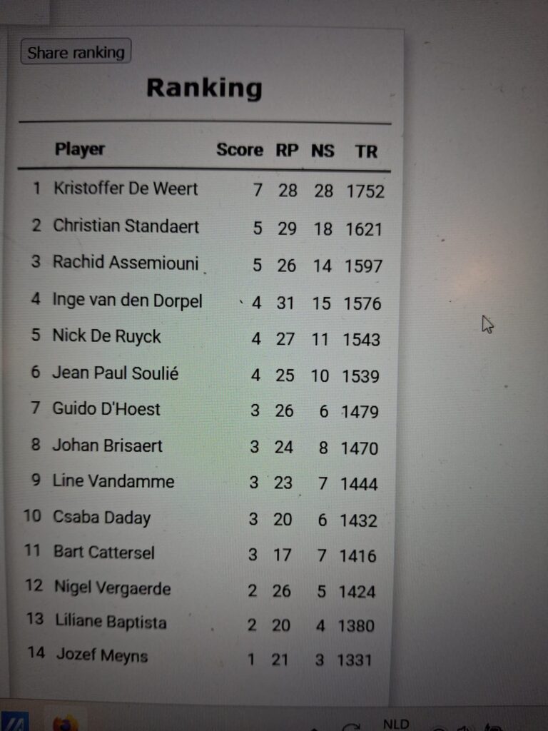 In round 6, Firat scored another victory, strengthening his lead. Vincent Hubert also won a clash between intermediates and is now on 5 points. Bert scored a win over Toon Van Herreweghen for a total of 5 points. In the beginners category, Johan Brisaert won from Line Vandamme, arriving at 4 points, while his closest competitor, Riza Yalçin, remained at 3 points after losing from Ronny Conaert.