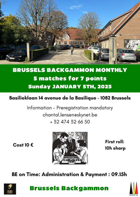 The Brussels BBBB Backgammon Club is delighted to invite you to its 102nd Brussels Friendly Tournament, which will take place at l’Orée, Drève des Brûlés 59, 1150 Brussels on Sunday 3 March 2024.
