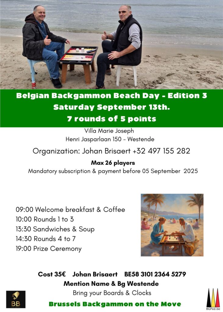 Congratulations to Johan Brisaert, winner and organizer of the 1st Belgian Backgammon Beach Day!