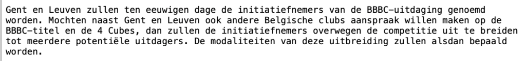(original text/not translated) Reclaiming that title and the accompanying set of cubes became a matter of honor and the reason for several meetings between Ghent and Leuven. The title went back and forth several times.