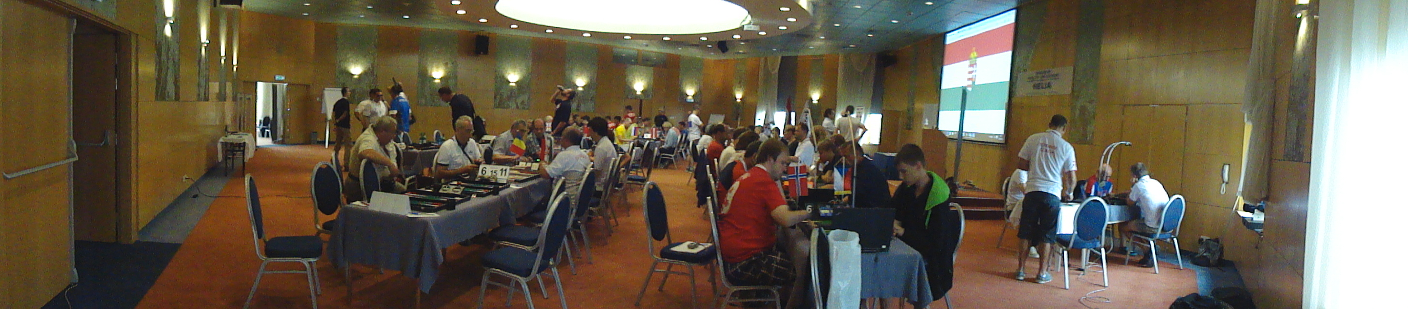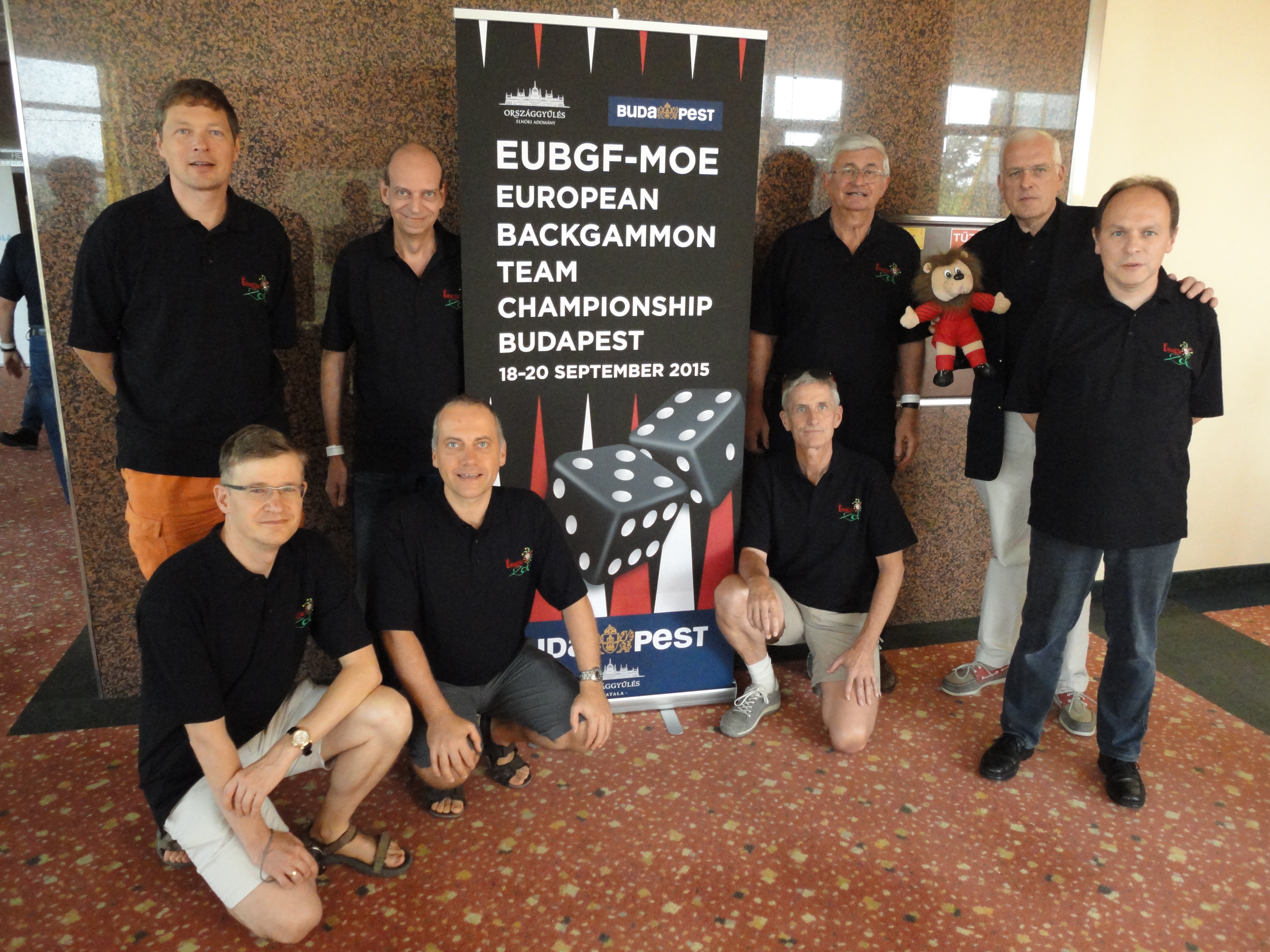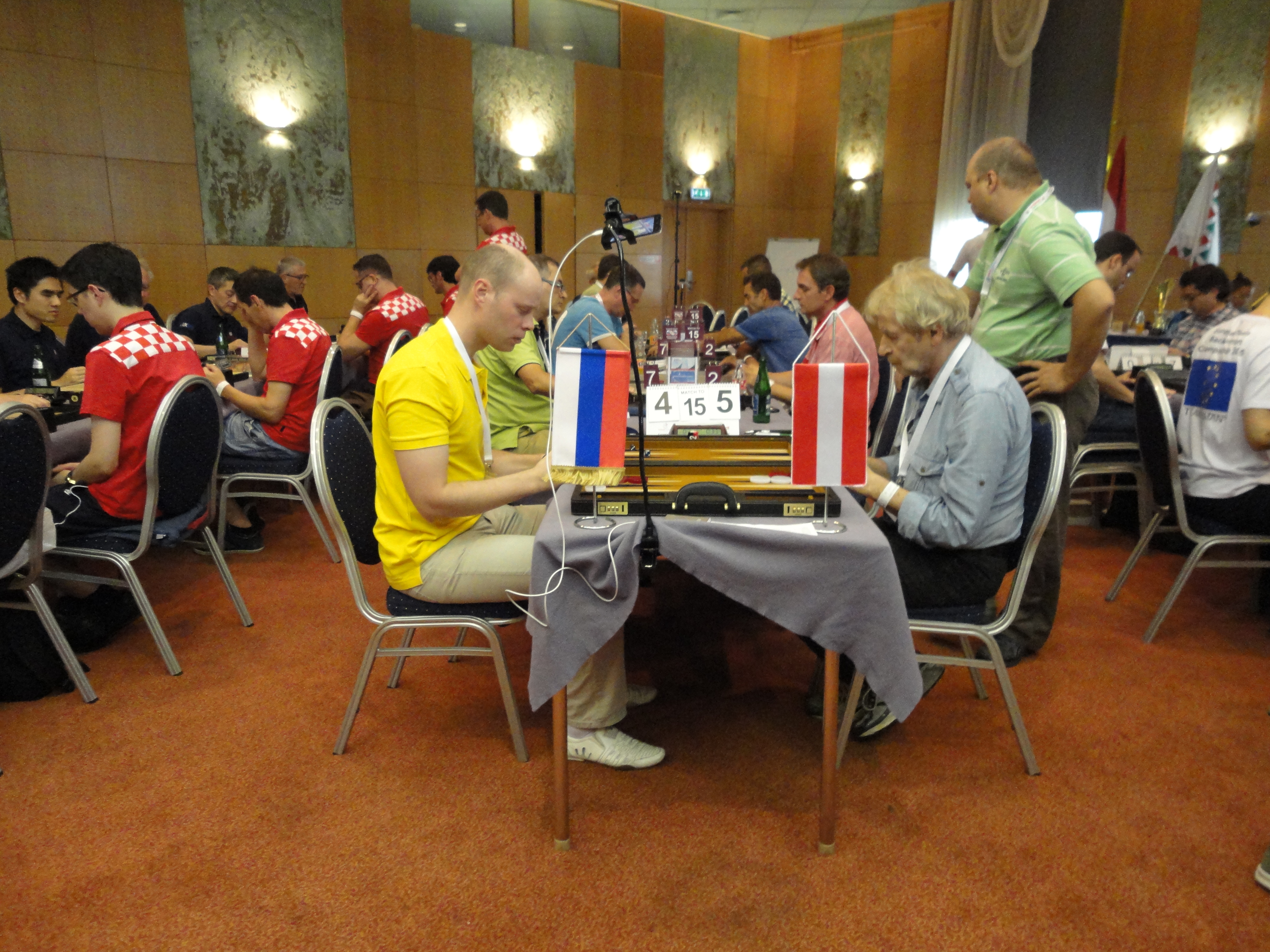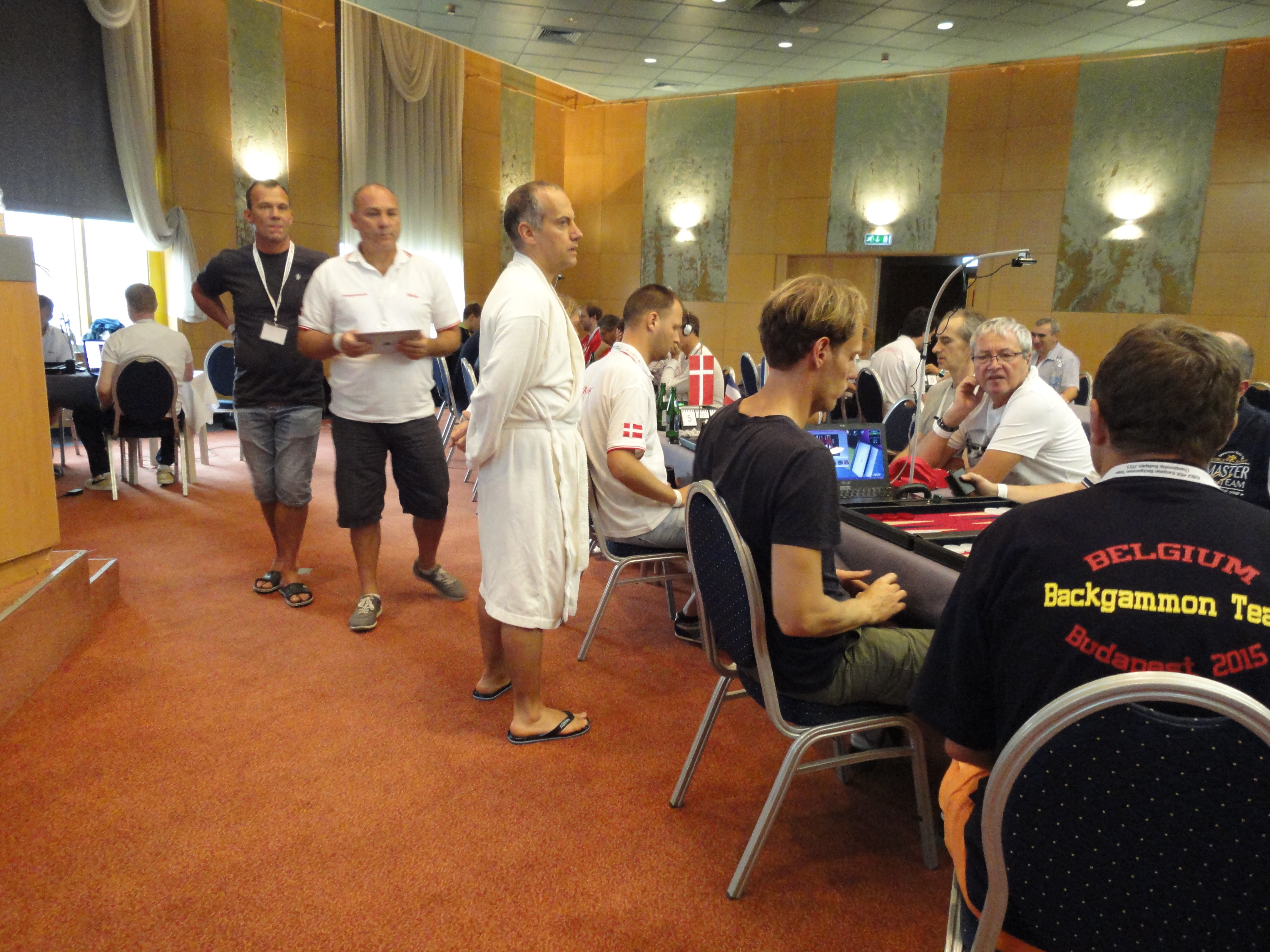 The team competition is a Swiss System tournament with 15 teams and 7 rounds. The top 4 qualifies for the play-offs. It is still not clear if match points or board points takes preference. In every round a team will have a bye, which can lead to very annoying situations in the final round. The team with a bye wins the match 3-1. Playing time for the 15-point matches is 40 minutes + 12 seconds but breaks are included in the players time. This system was also used at the first Brugge Backgammon Day, and we were convinced that this was not a good idea. In Budapest I see the same tendency: people hardly take a break and use their time playing, which of course delays procedures.