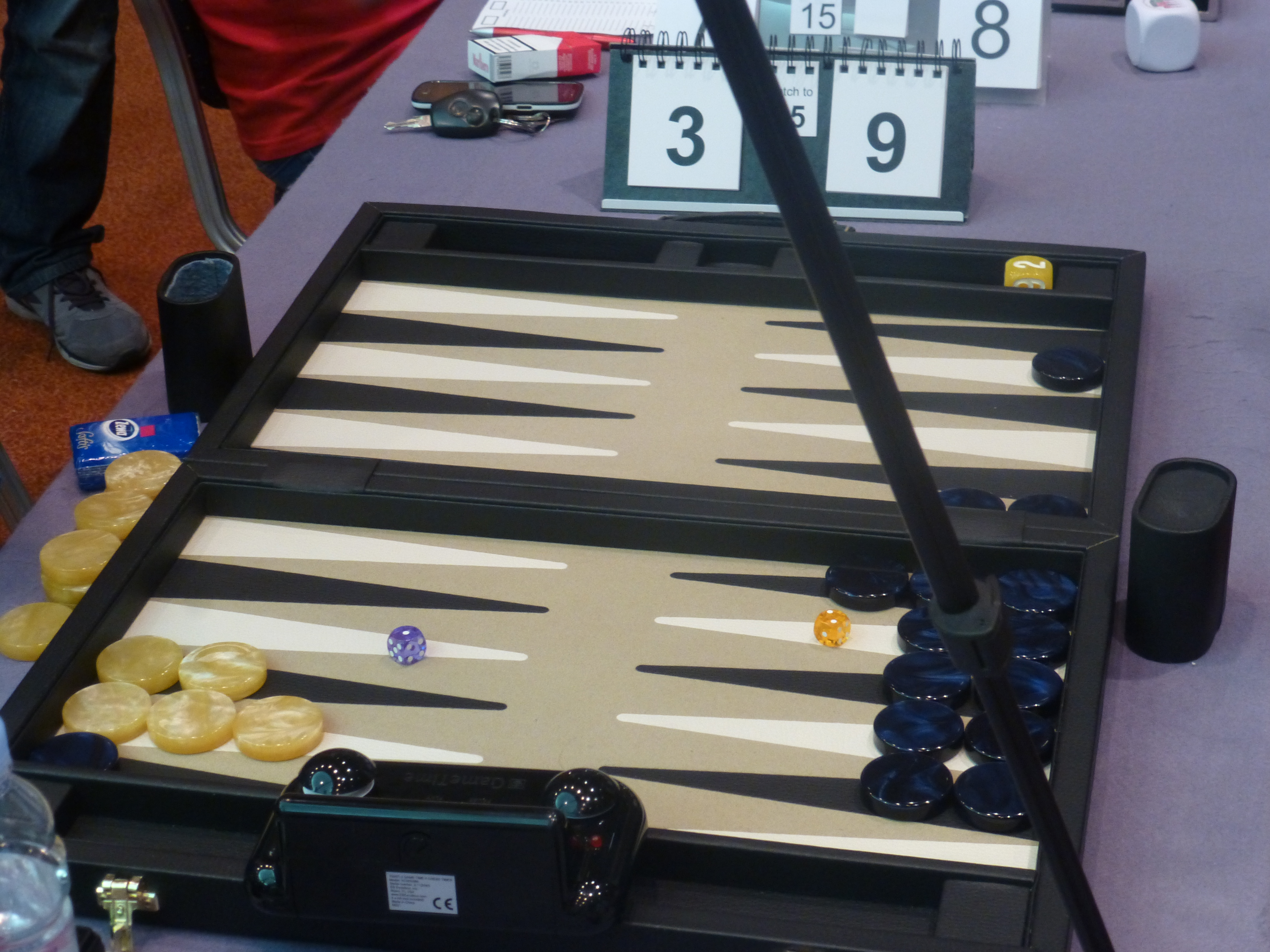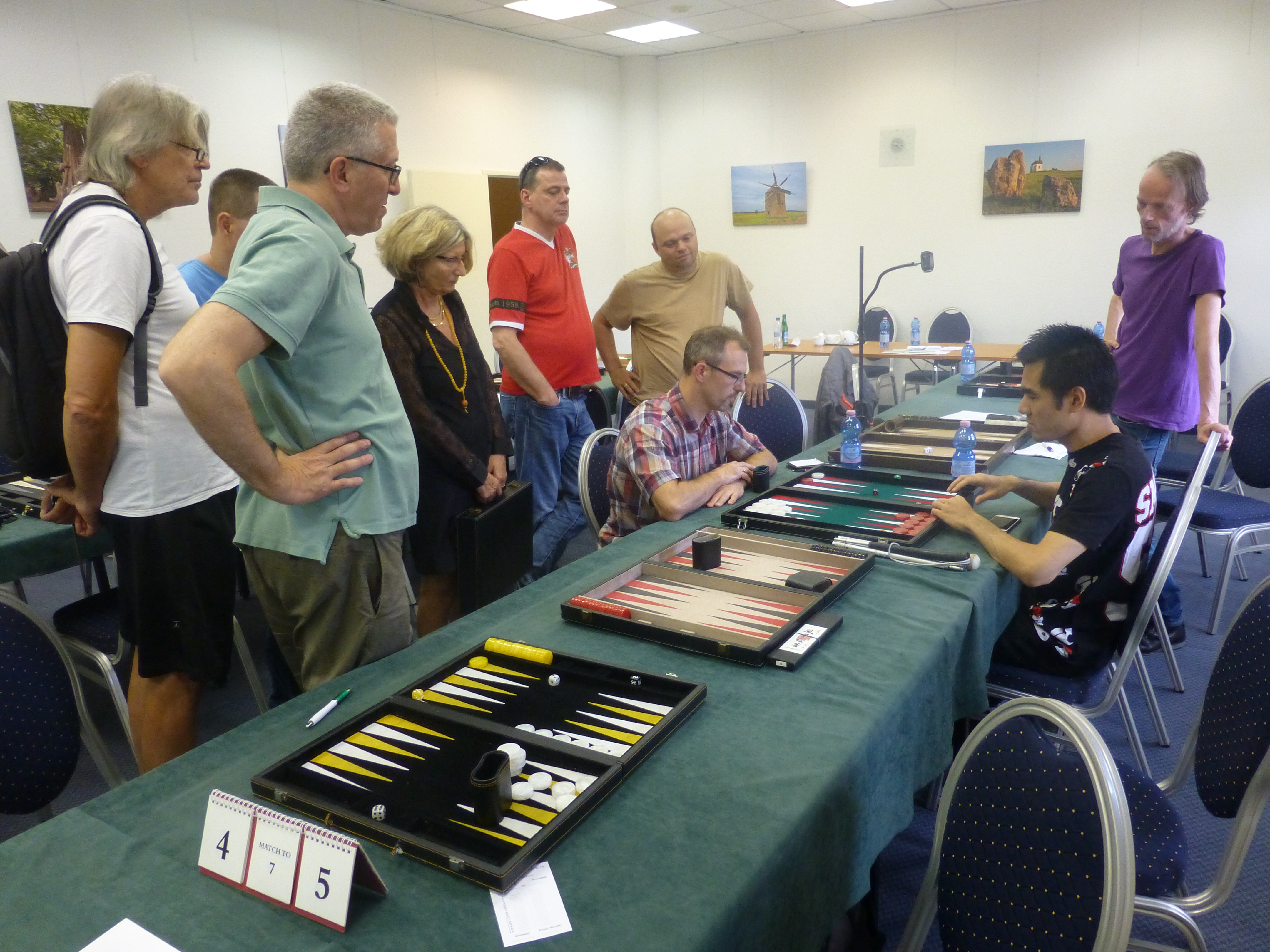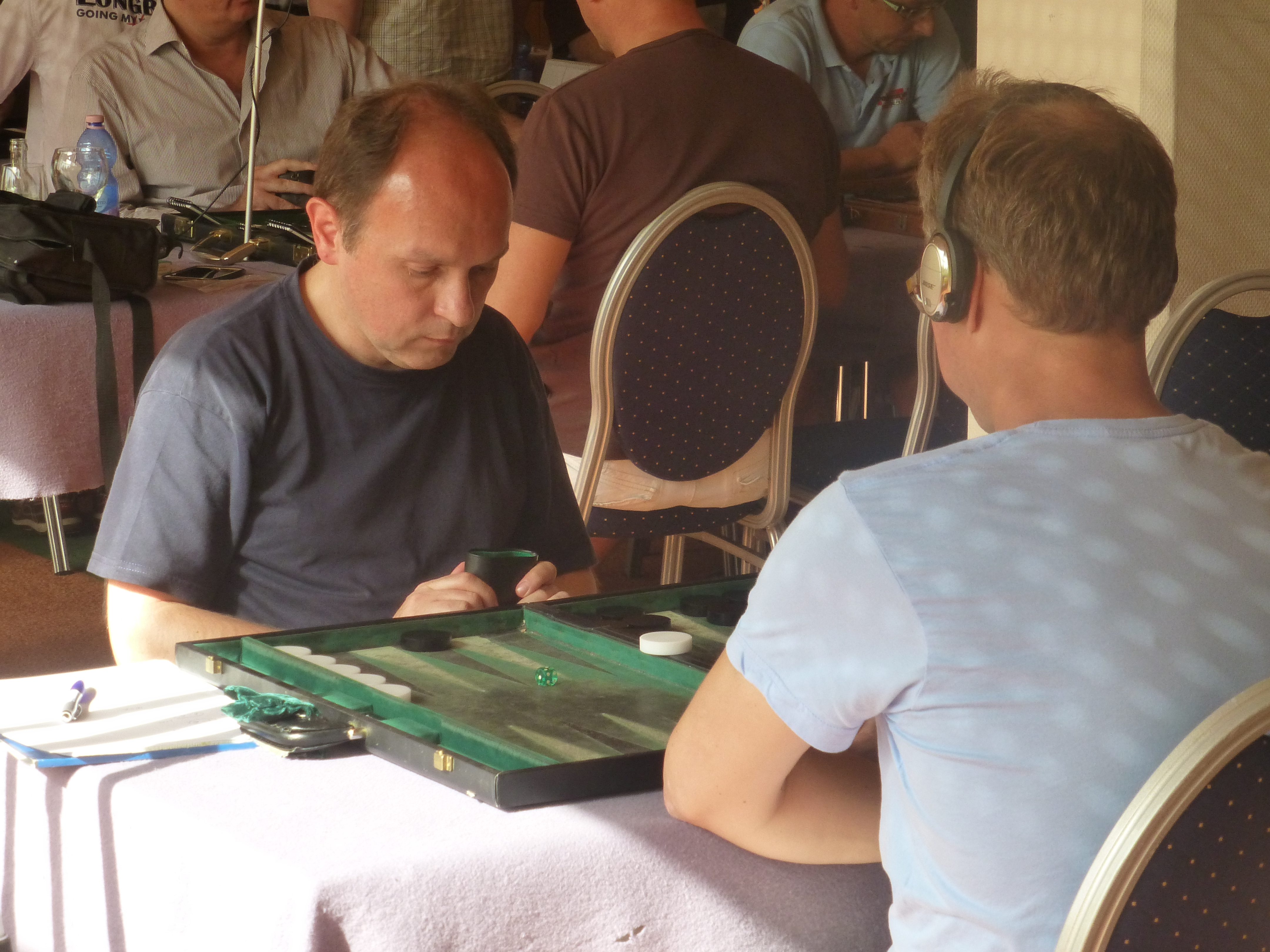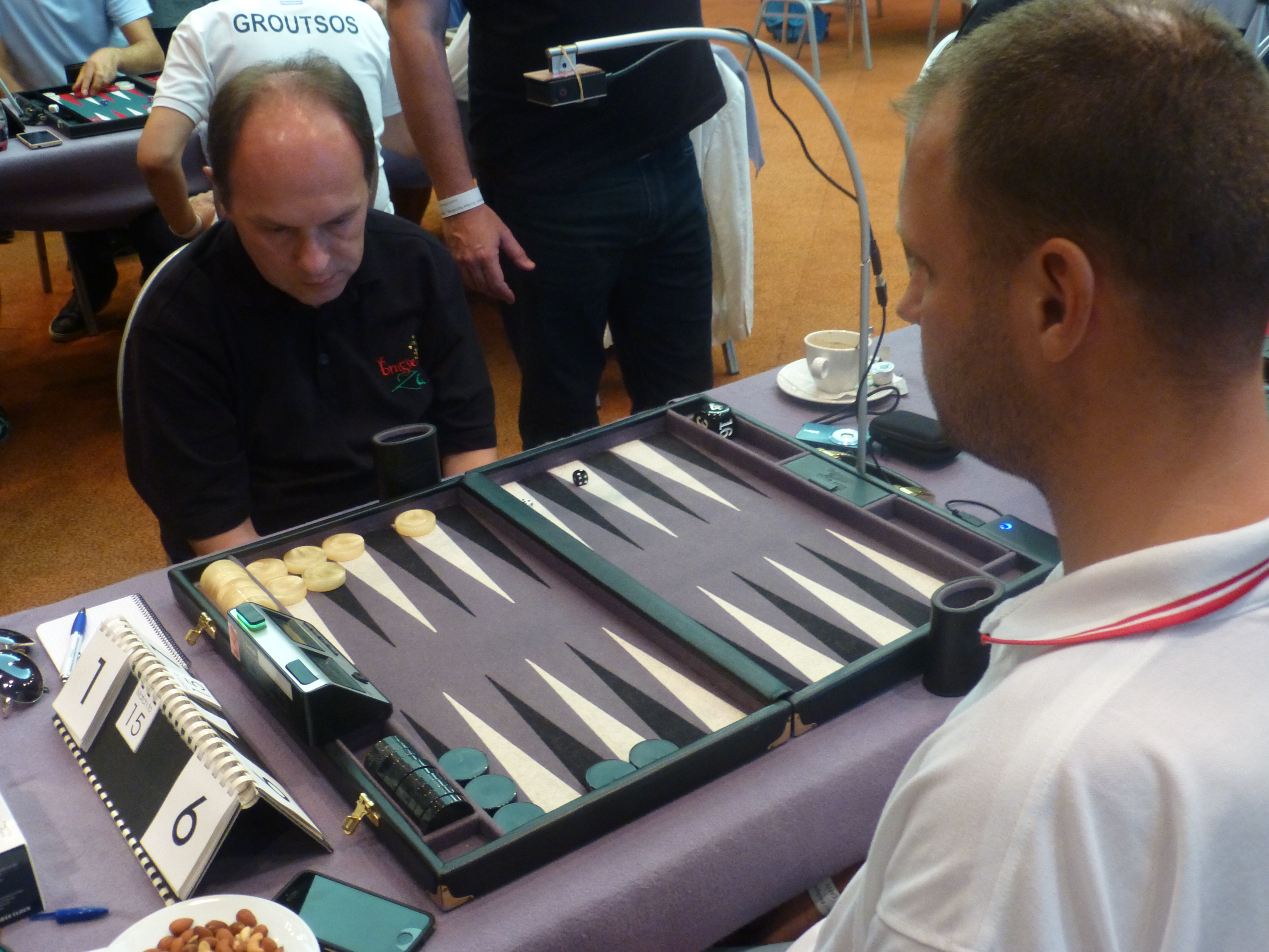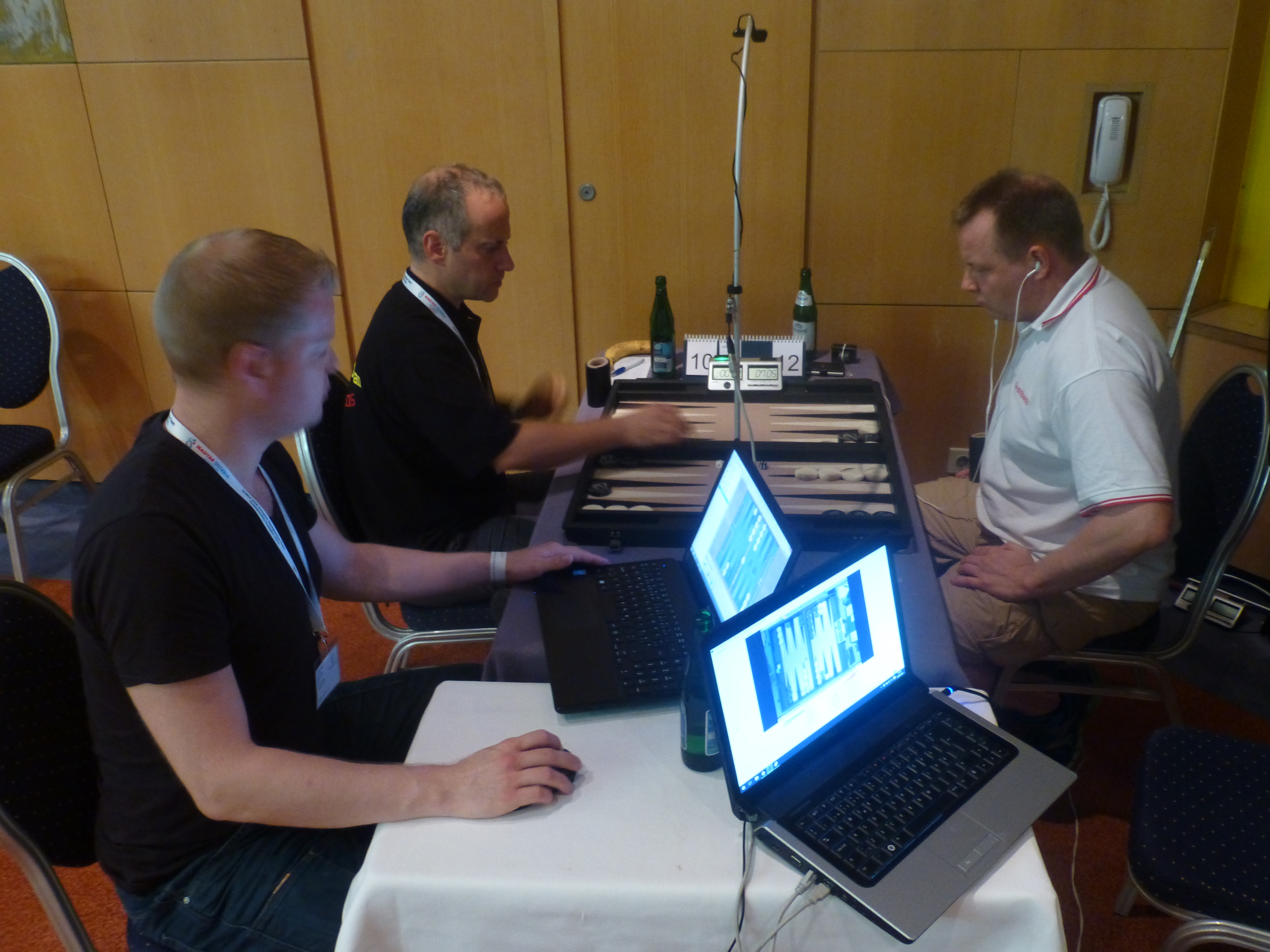 Geert van der Stricht plays Steen Grønbech (right). Geert was very close to winning but Steen rolled a 44 to enter his 2 checkers in a 5-point board, turning the game and the match around. This match was live streamed on the website of the Danish federation.