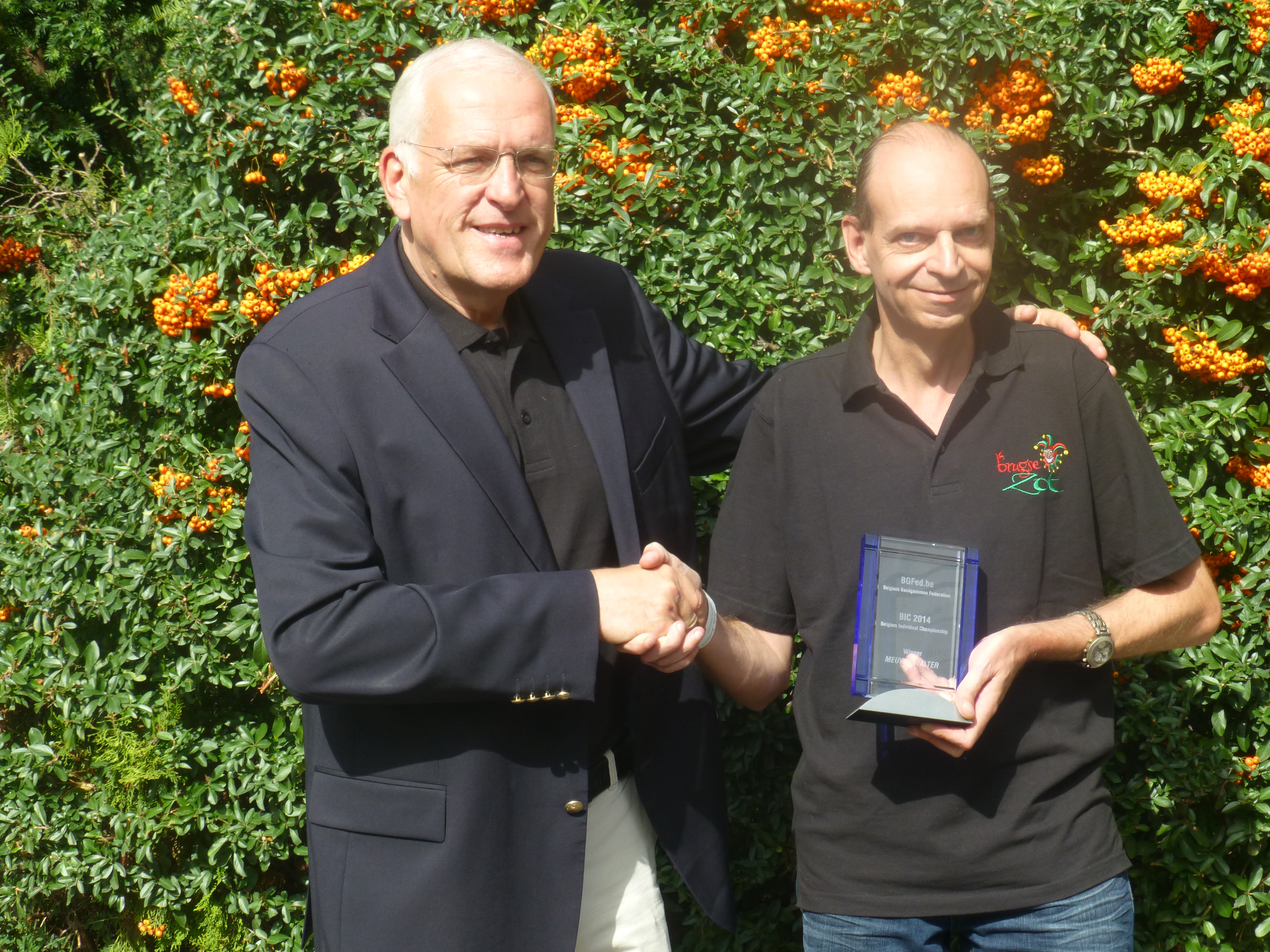 Walter Meuwis (right) received the 2014 Belgian Individual Championship (BIC) trophy from BGFed.be president Guy Van Middelem in Budapest. He won the title in December 2014, defeating Maurits Pino in the final.