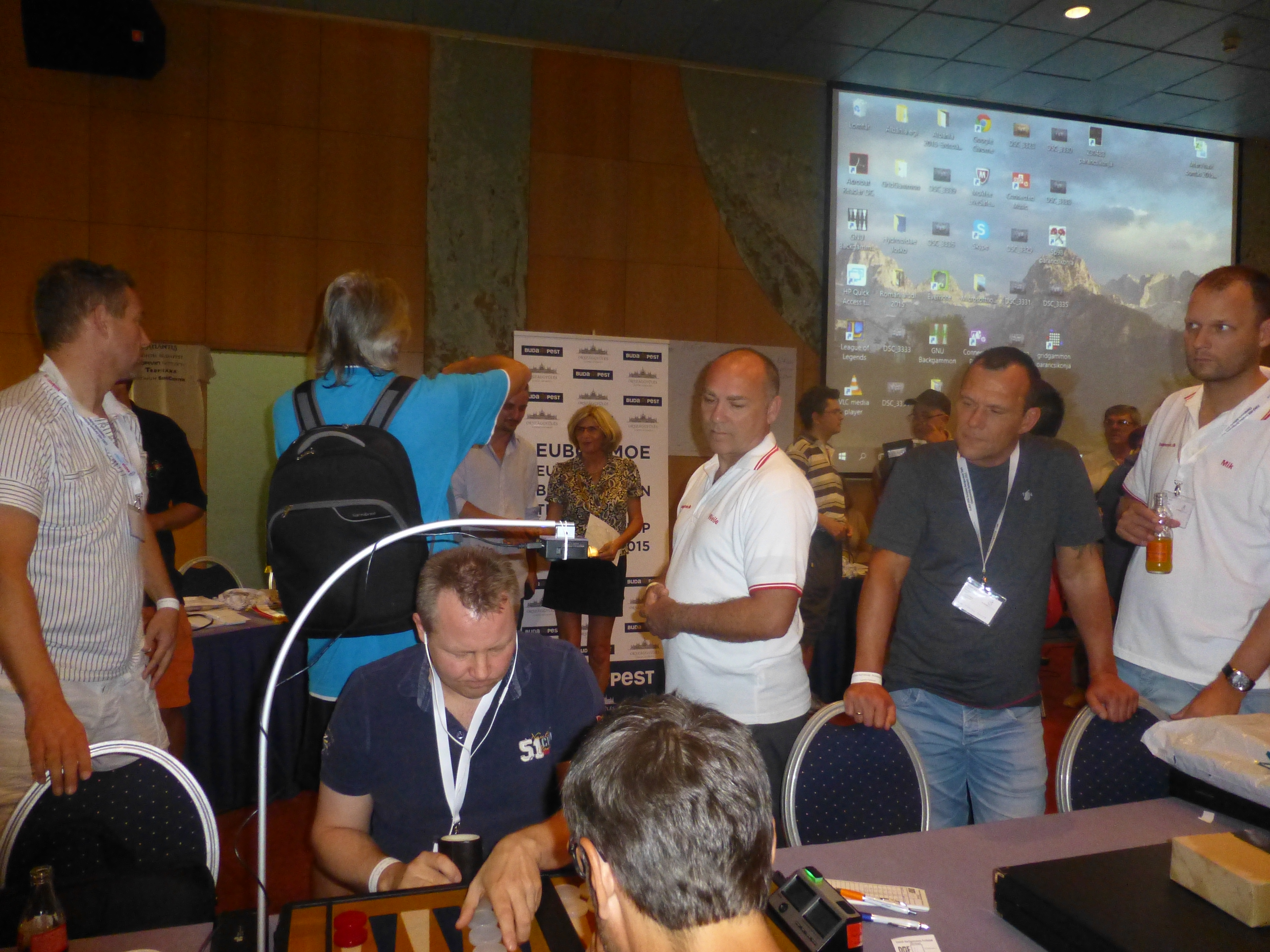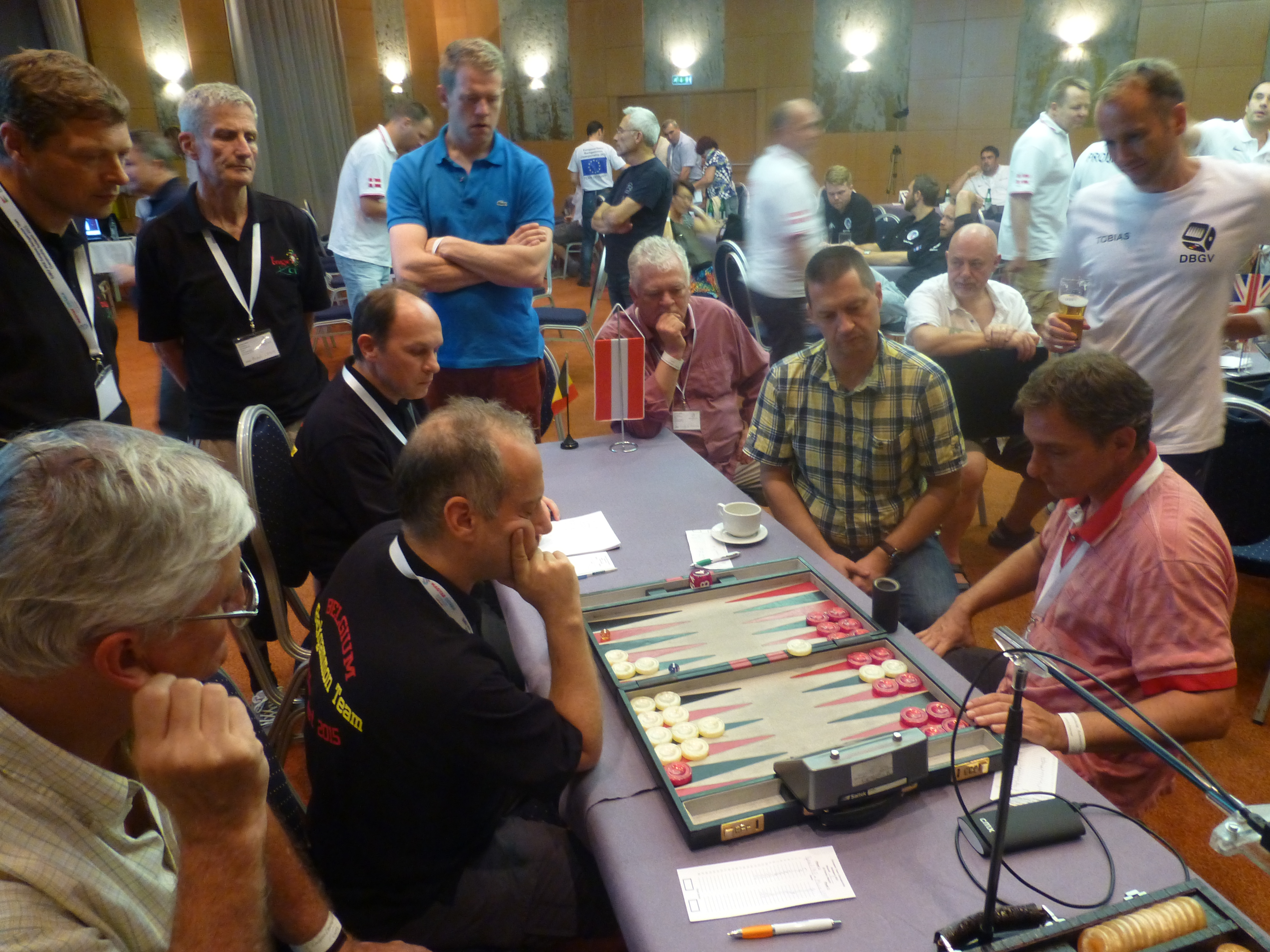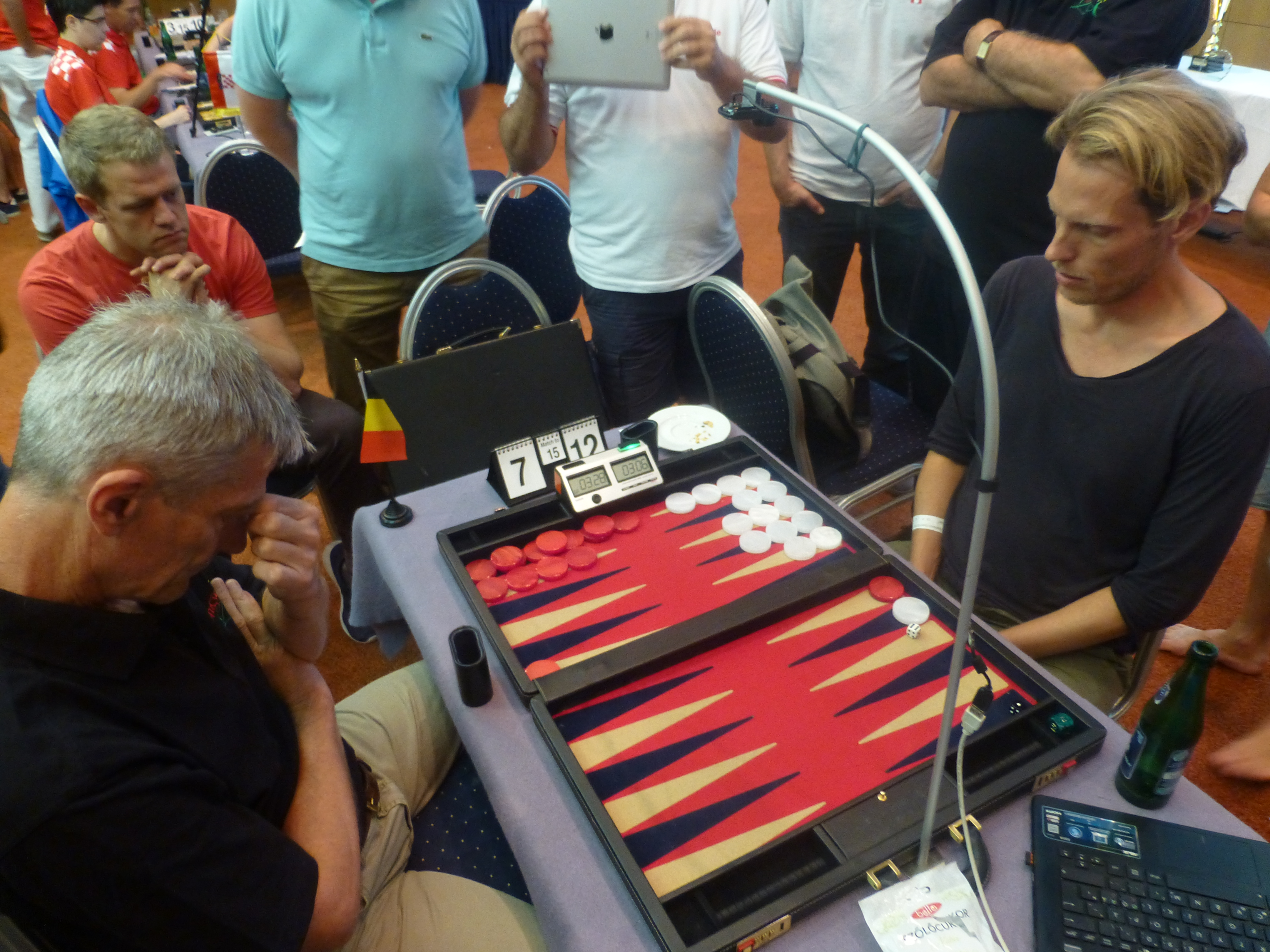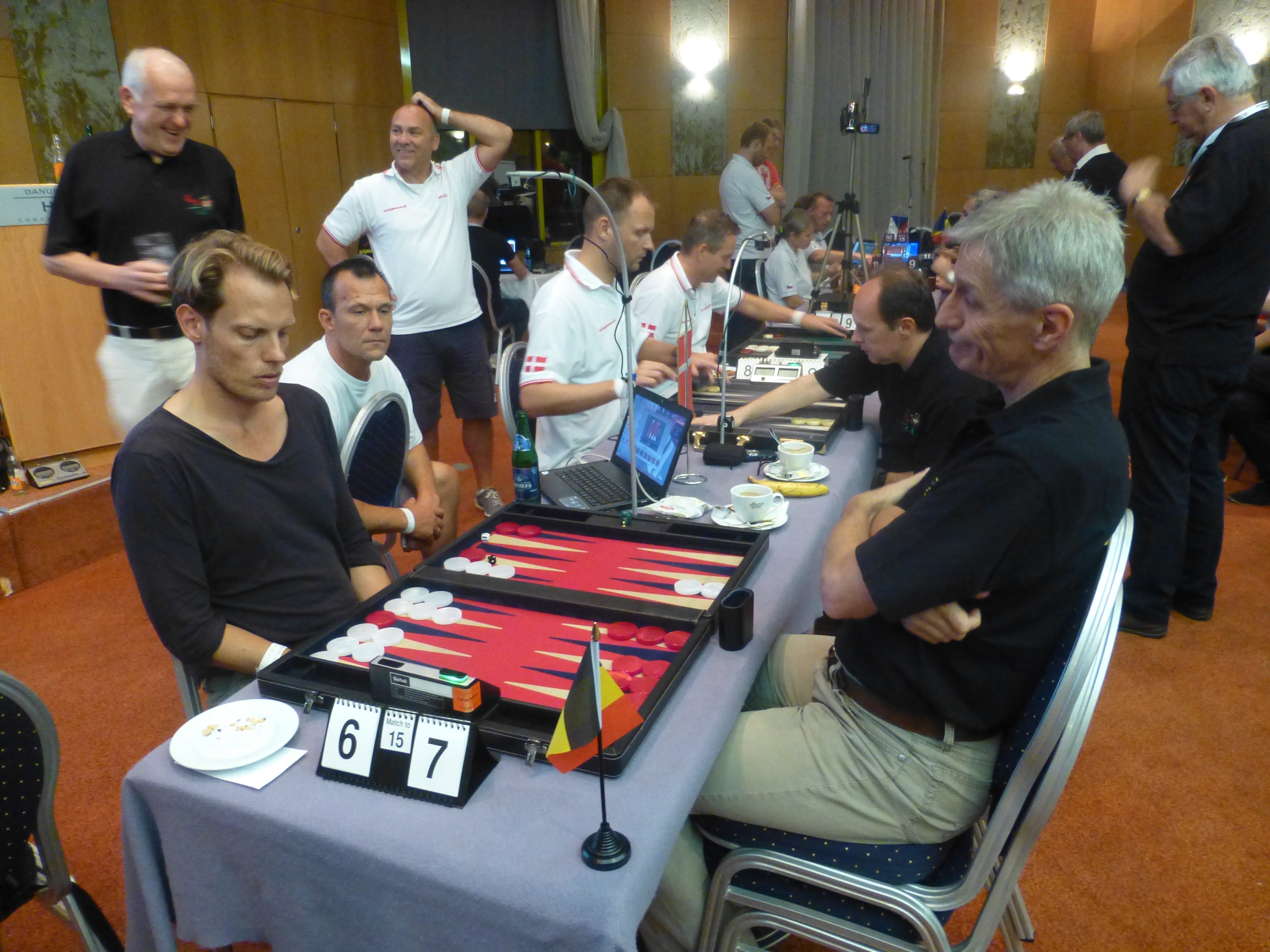 After two draws (against Hungary and Croatia), Belgium faced tournament leader and top favourite Denmark. Luc Palmans (left) contemplates an 8-cube against Mik Larsen. Doble/take, well played by both players. Luc won this game but sadly he lost the match 15:13.