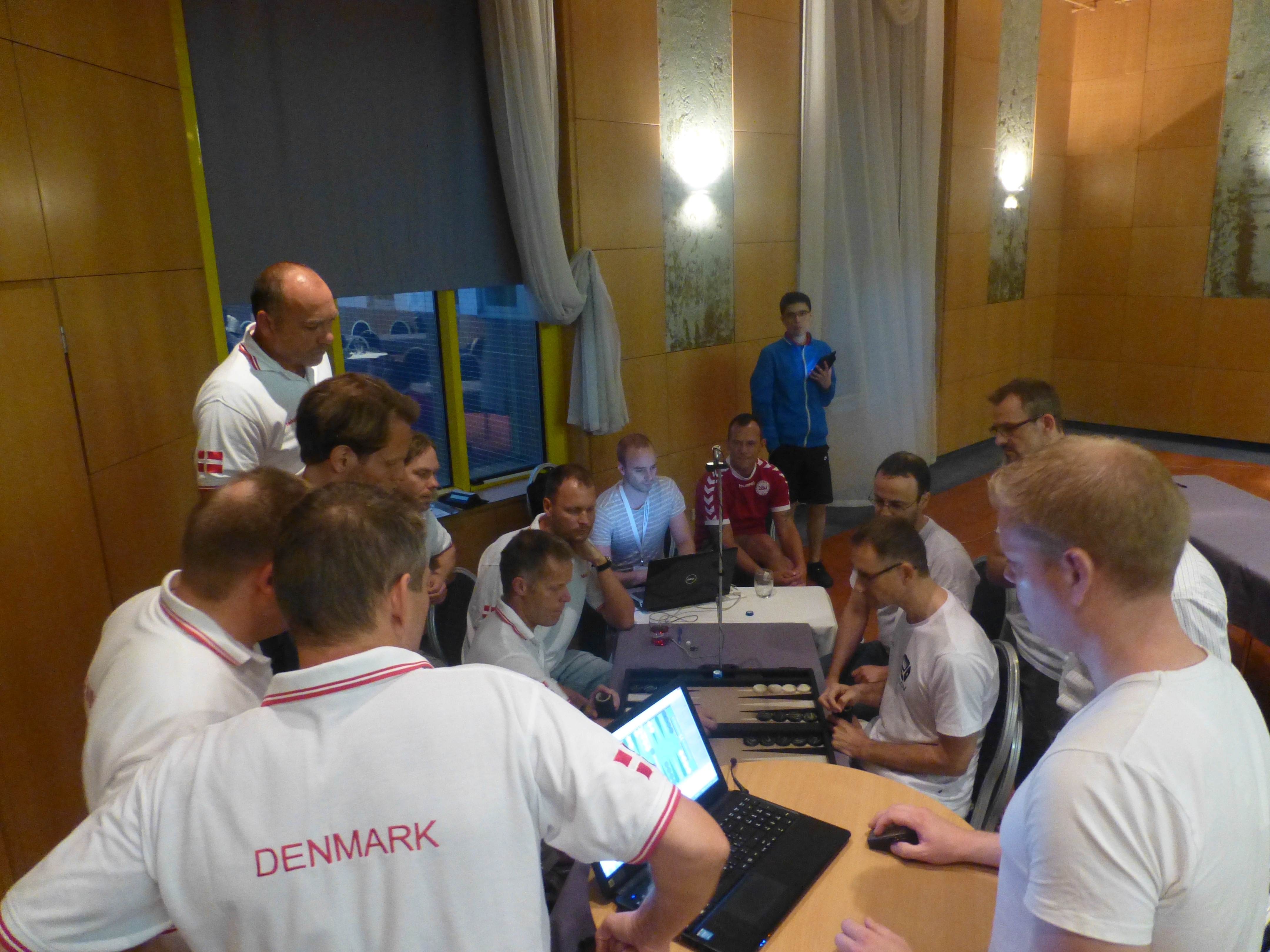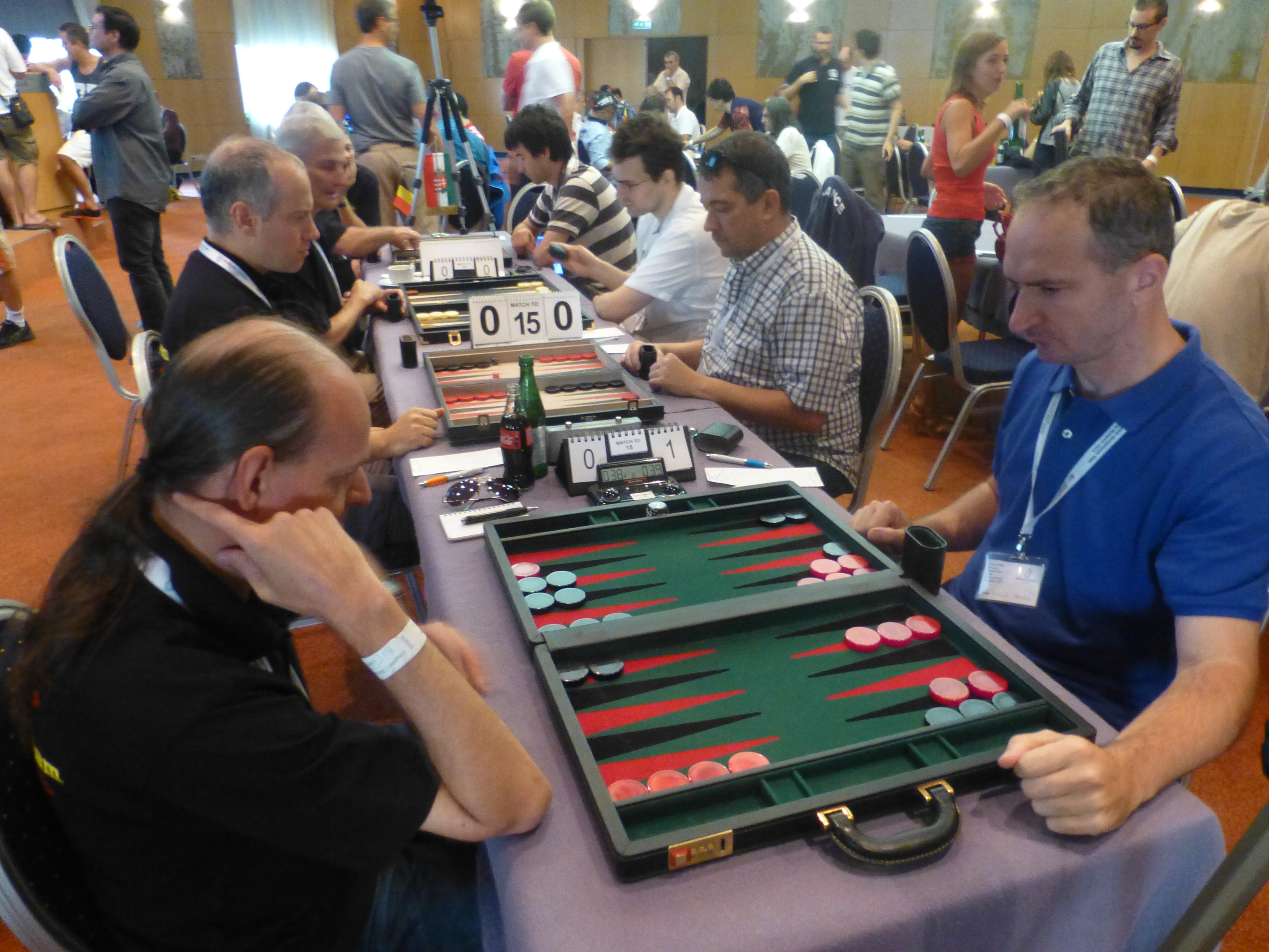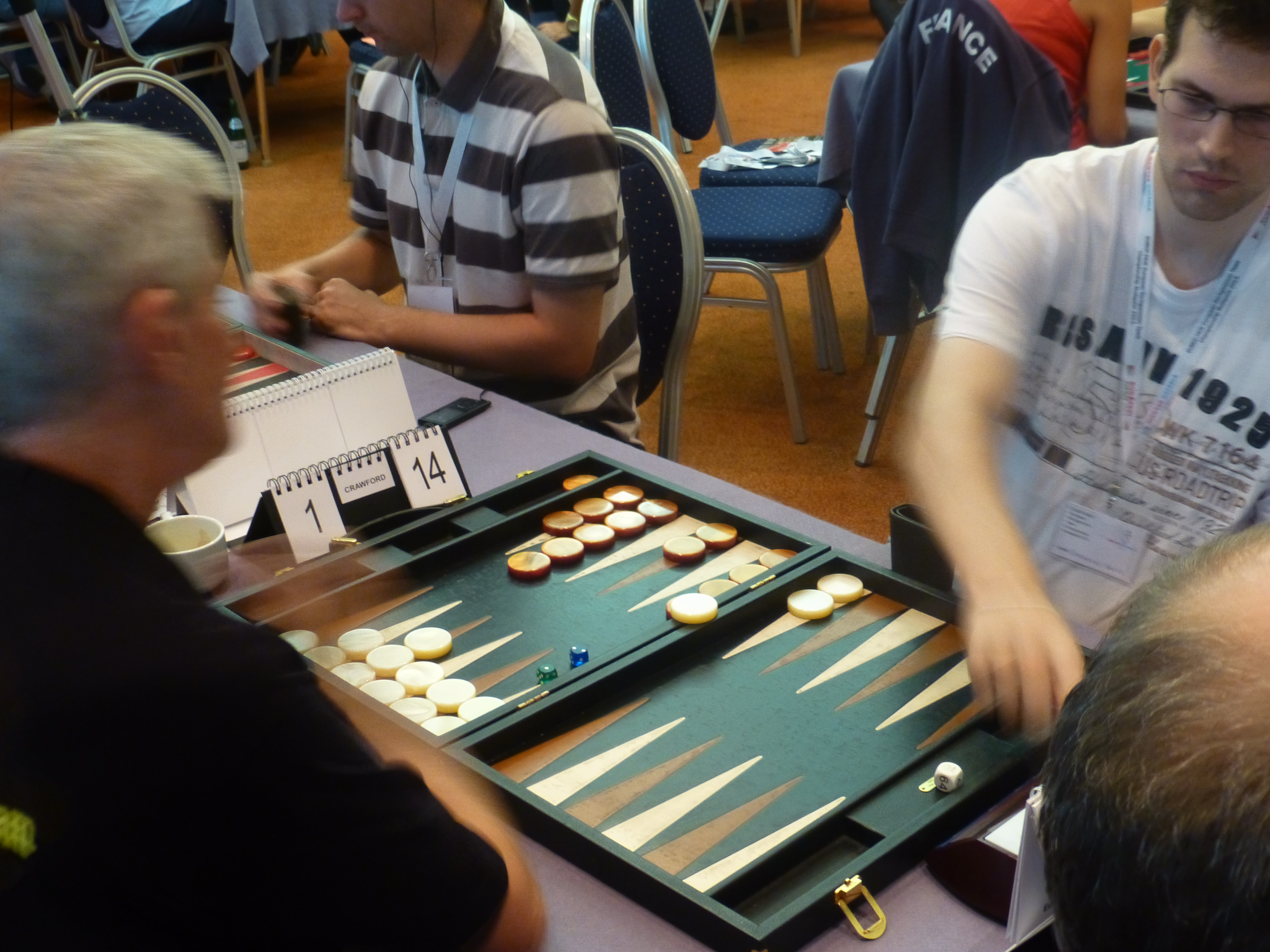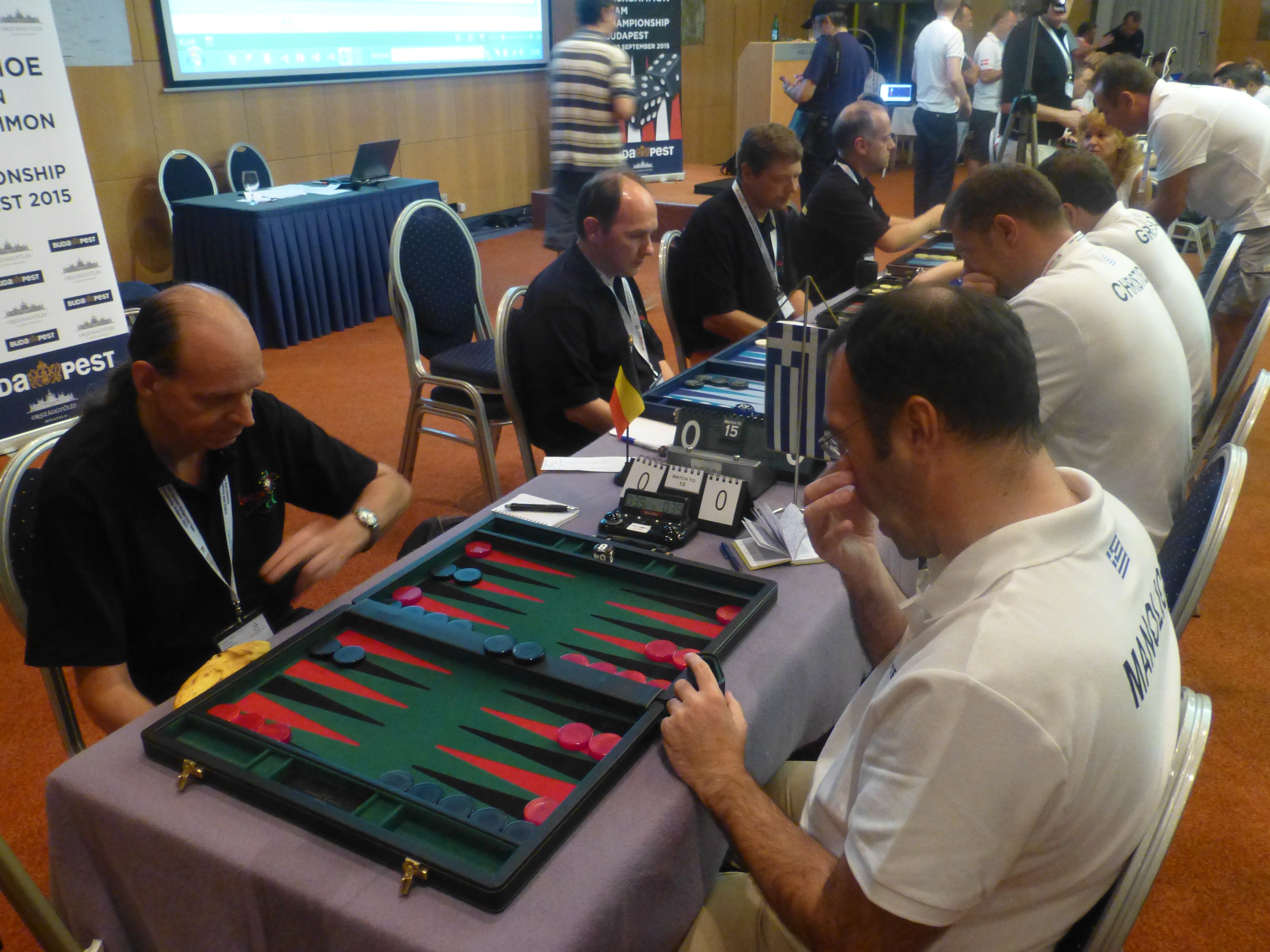 After two draws (against Hungary and Croatia), Belgium faced tournament leader and top favourite Denmark. Luc Palmans (left) contemplates an 8-cube against Mik Larsen. Doble/take, well played by both players. Luc won this game but sadly he lost the match 15:13.